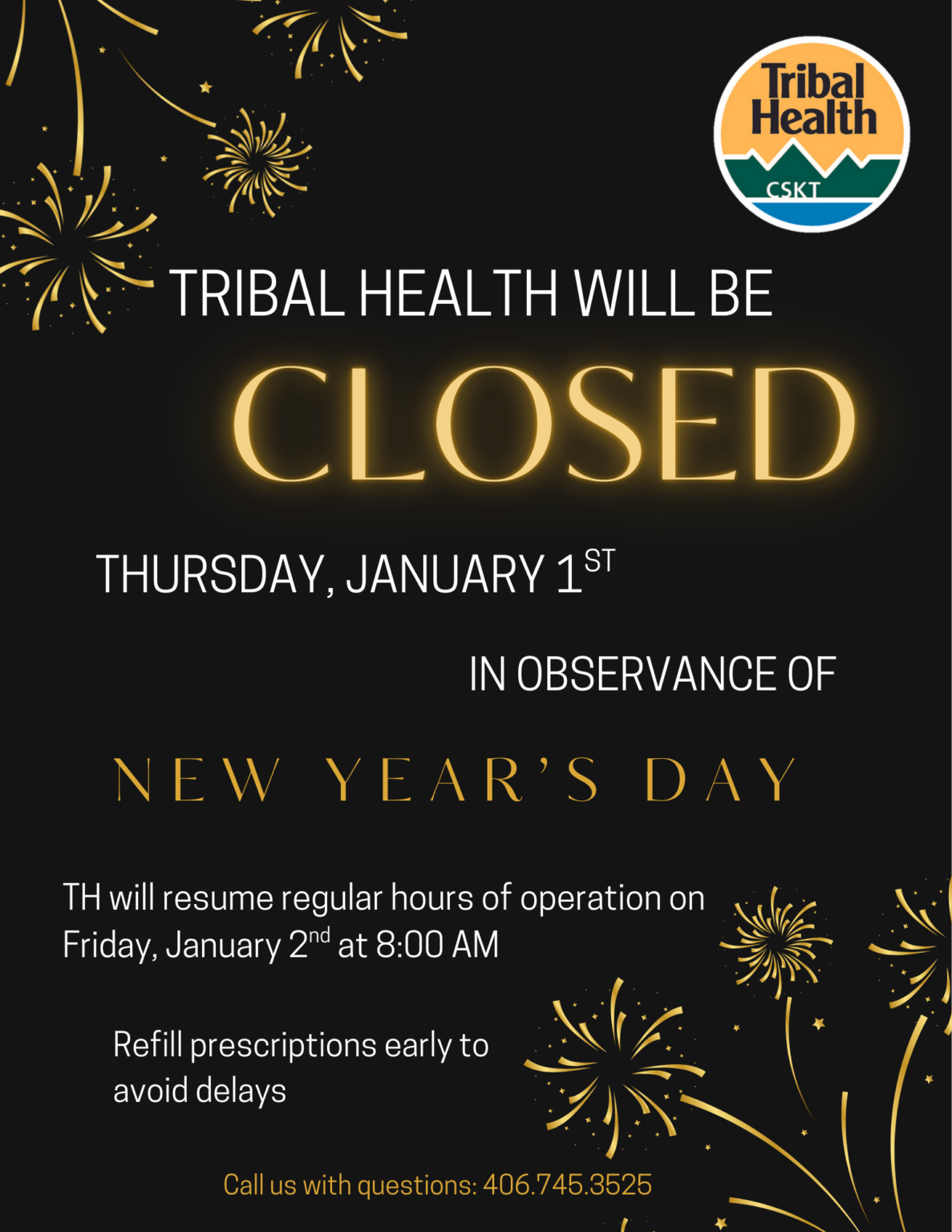 Tribal Council has approved an early closure for all CSKT departments on Wednesday, December 31st, at 12:00 PM. In alignment with this, TH will begin early closure at 12:00 PM + operate with limited staffing to ensure continuity of care; all previously scheduled appointments will be honored.